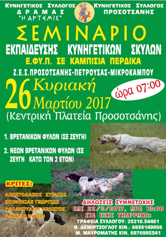 O Κυνηγετικός Σύλλογος Δράμας σε συνεργασία με τον Κυνηγετικό Σύλλογο Προσοτσάνης διοργανώνουν την Κυριακή 26 Μαρτίου 2017 και ώρα 7:00 το πρωί Σεμινάριο Εκπαίδευσης Κυνηγετικών Σκύλων (Ε.ΦΥ.Π.) σε καμπίσια πέρδικα στην Ζ.Ε.Σ. Προσοτσάνης – Πετρούσας – Μικρόκαμπου.